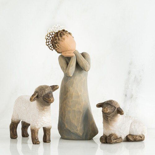 1、Standing figure in blue-gray dress, with hands up to chin, wearing crown of pierced gold filigree of hearts.2、Two white sheep: one lying down, one standing with dark face and feet.tallest is 3”h. All dimensions are measured manually with deviation.ranged. we are sorry for that.